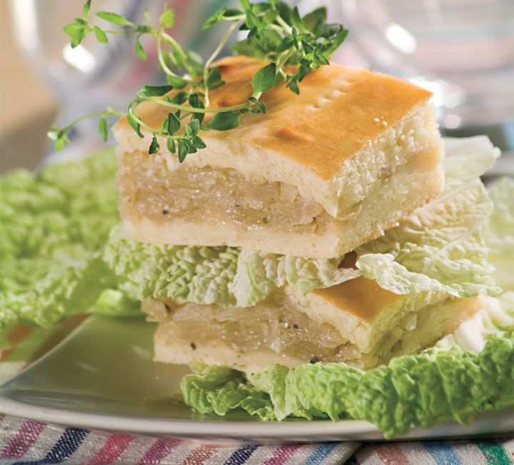 Pour the room temperature kefir into a bowl. Add yeast, lightly beaten eggs, sugar, salt and oil. Mix thoroughly and knead in flour. Cover with a towel and let it leaven in a warm place for about 2 hours. For the filling, shred the cabbage and onions finely. Melt butter in a pot and add cabbage and onions to sauté for 45 minutes. Season with salt, syrup, pepper and marjoram. Add vinegar and allow to cool.